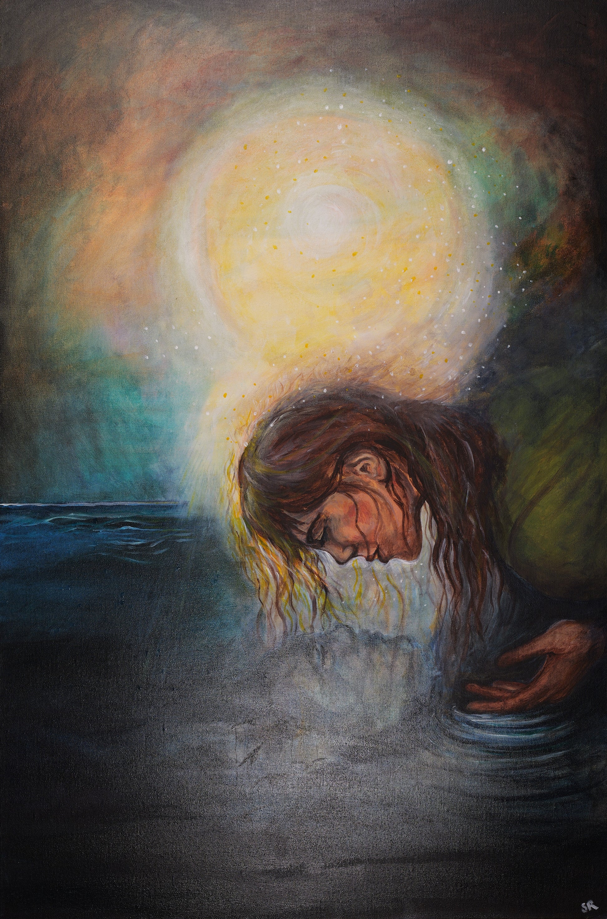 'Dance in the Shadows' is an original acrylic painting on a large canvas. The painting invites the viewer into a moment of profound introspection and emotional honesty. The figure leans over the dark waters, observing her shadowed reflection gazing back at her, as a celestial glow above emanates from within. The painting symbolizes the journey of looking within, into one's own depths, acknowledging darkness, and transforming it into strength and clarity.